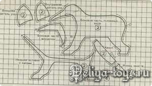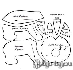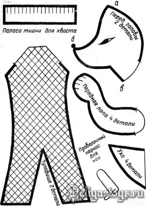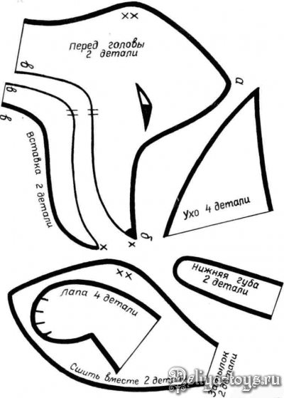 Его выкройка состоит из из следующих деталей: 2 детали туловища, 3 детали - голова (перед- 2 детали и затылок- 1 деталь), уши - 4 детали, передние лапки - 4 детали, туфли - 2 детали, подошвы - 2 детали, хвост - 1 деталь. (Для увеличения выкроек - нажмите на них)