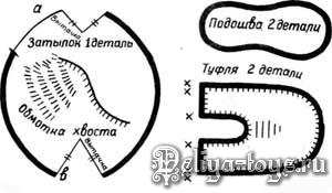Туфли делаем из несыпучей ткани (фетра, дерматина) и сшиваем петельным швом по лицевой стороне. В сшитую туфлю вставляем картонную стельку (подошву) для большей устойчивости. Когда голова и туфли будут пришиты к туловищу, прикрепляем сшитые передние лапы. Их можно просто пришить или сделать подвижными при помощи веревочного крепления.
