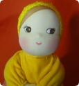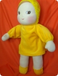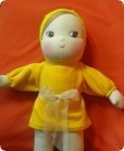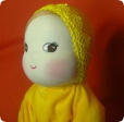 Одежда пришивная - платье, шапочка, ботиночки прочно пришиты к кукле. Это позволяет начинать играть с куколкой уже с года, с ней так удобно спать в обнимочку :) Вместо волосиков на голове пришивная шапочка, поэтому не так страшно, если ребенок решит искупать куколку, куколку так же можно брать с собой в отпуск, ведь уход за куколкой очень легкий.